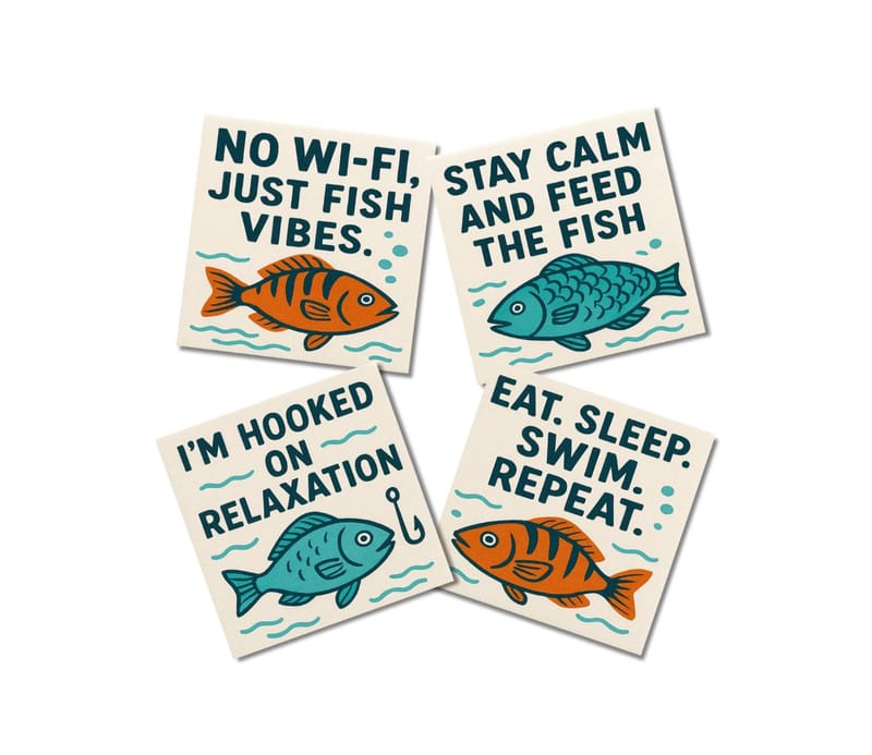 סט 4 תחתיות לכוסות בעיצוב דגים צבעוני וקליל, עם משפטים מצחיקים שיעלו חיוך בכל לגימה.