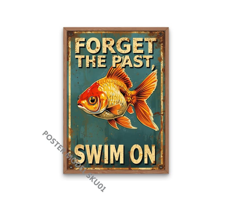 עיצוב וינטג’ מרהיב עם דג זהב צבעוני ומסר חיובי – "שכח את העבר, שחֵה קדימה".
