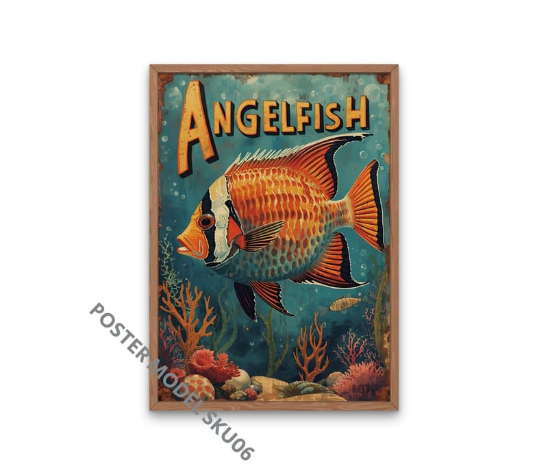 פוסטר קיר מעוצב בסגנון רטרו וינטג' המציג את דג המלאך (Angelfish) במלוא הדרו – יצירה מושלמת לכל חובב עולם המים והעיצוב הקלאסי.